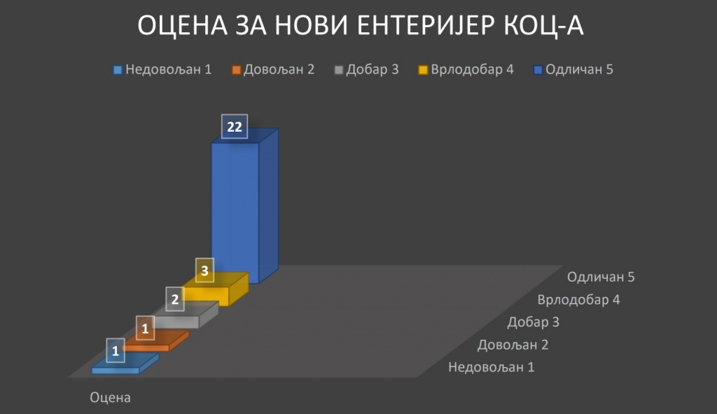 ocena     Шест месеци била је актуелна анкета у вези са новим ентеријером КОЦ-а. Резултати су следећи: