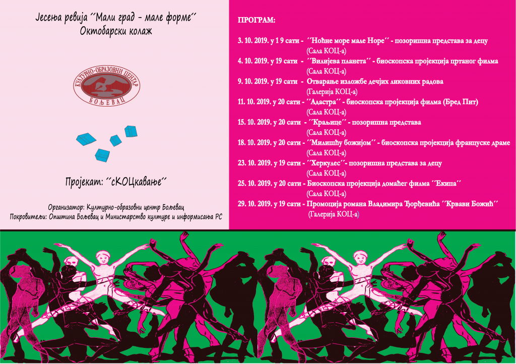 oktobarski kolaz13      Други део јесење ревије ''Мали град - мале форме'' - Окробарски колаж, публици нуди богат и разноврстан програм. У првој половини октобра, поводом Дечје недеље, на репертоару ће бити две позоришне представе за децу (Ноћне море мале Норе и Херкулес), пројекција француског анимираног филма за децу, отварање изложбе дечјих радова насталих током године на конкурсима и радионицама које је КОЦ организовао за најмлађе.